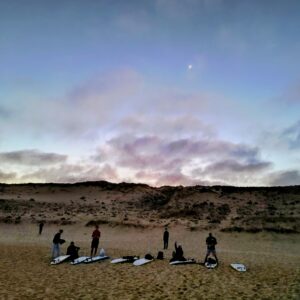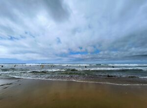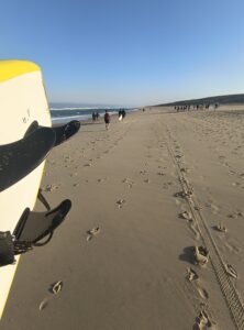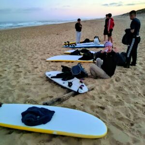 Gleich zu Beginn zeigte sich der Atlantik von seiner kraftvollen Seite: Wellen von bis zu dreieinhalb Metern Höhe auf der ersten Sandbank draußen sorgten weiter vorn nah am Strand im Anfängerbereich für monstermäßige Strömung. Eine echte Herausforderung: „Das Wasser zieht einem förmlich die Beine beim Gehen weg!“, klagte so mancher erschöpft. Und trotzdem: Keiner gab auf – auch wenn der lange Weg mit dem großen Anfängerboard über die Sanddüne und den Strand durchaus schweißtreibend war. Selbst als es am Donnerstag wegen der Gezeiten in aller Frühe gegen 7 Uhr losging, zogen alle mit, auch wenn Aussagen wie „Oh Mann, ich kann nicht mehr!“ und „Mein Arm tut so weh!“ oder „Wie weit müssen wir denn noch gehen?“ vor allem in den ersten Tagen oft mit durchaus gequältem Unterton zu hören waren.